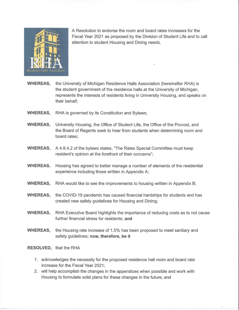 Each year, the UM Board of Regents votes in June to decide the budget of the next fiscal year including both tuition and housing. You can find more about all budget changes here. It is the duty of RHA to bring forward resident interests to the discussion of housing rate changes as outlined in our constitution.